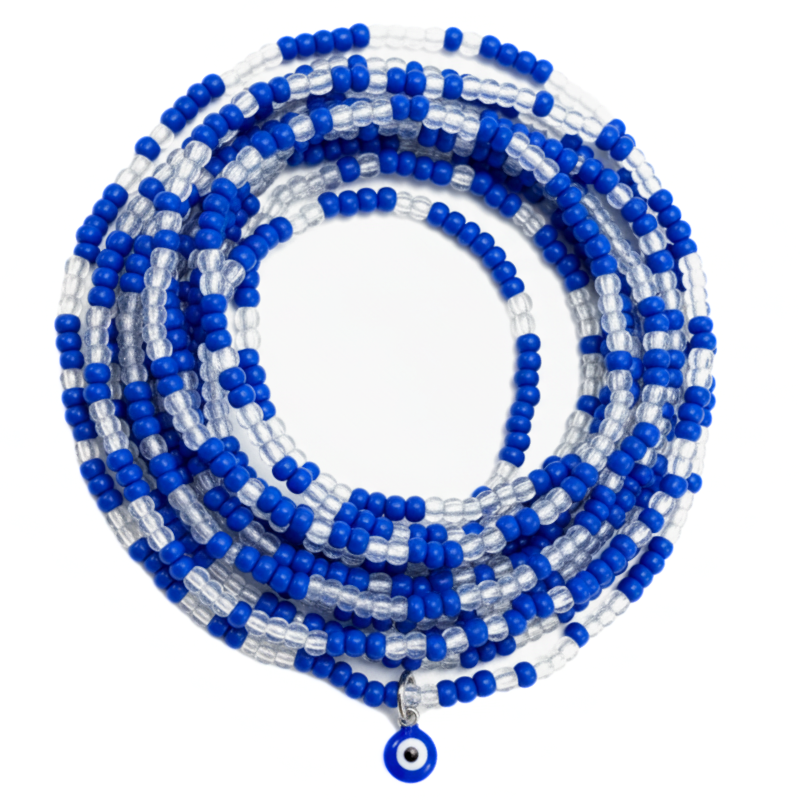 Stay protected with this Blue & Crystal Waist Beads set, featuring a bold blue Evil Eye charm. The shimmering crystal beads and calming blue tones create an eye-catching look, while the Evil Eye charm adds a touch of symbolism for warding off negative energy. Wear it as a bracelet, anklet, or necklace for a versatile, meaningful accessory!