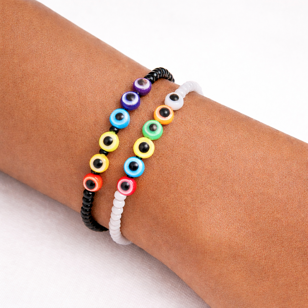 • Features 7 chakra-colored evil eye beads