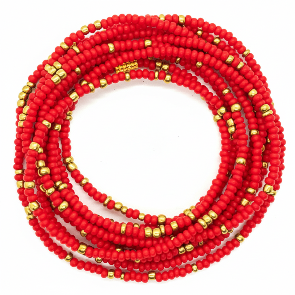 Shine softly with these Gold & Red Waist Beads, handmade with a mix of metallic gold and vibrant red seed beads.  Worn for confidence, beauty, and cultural pride.