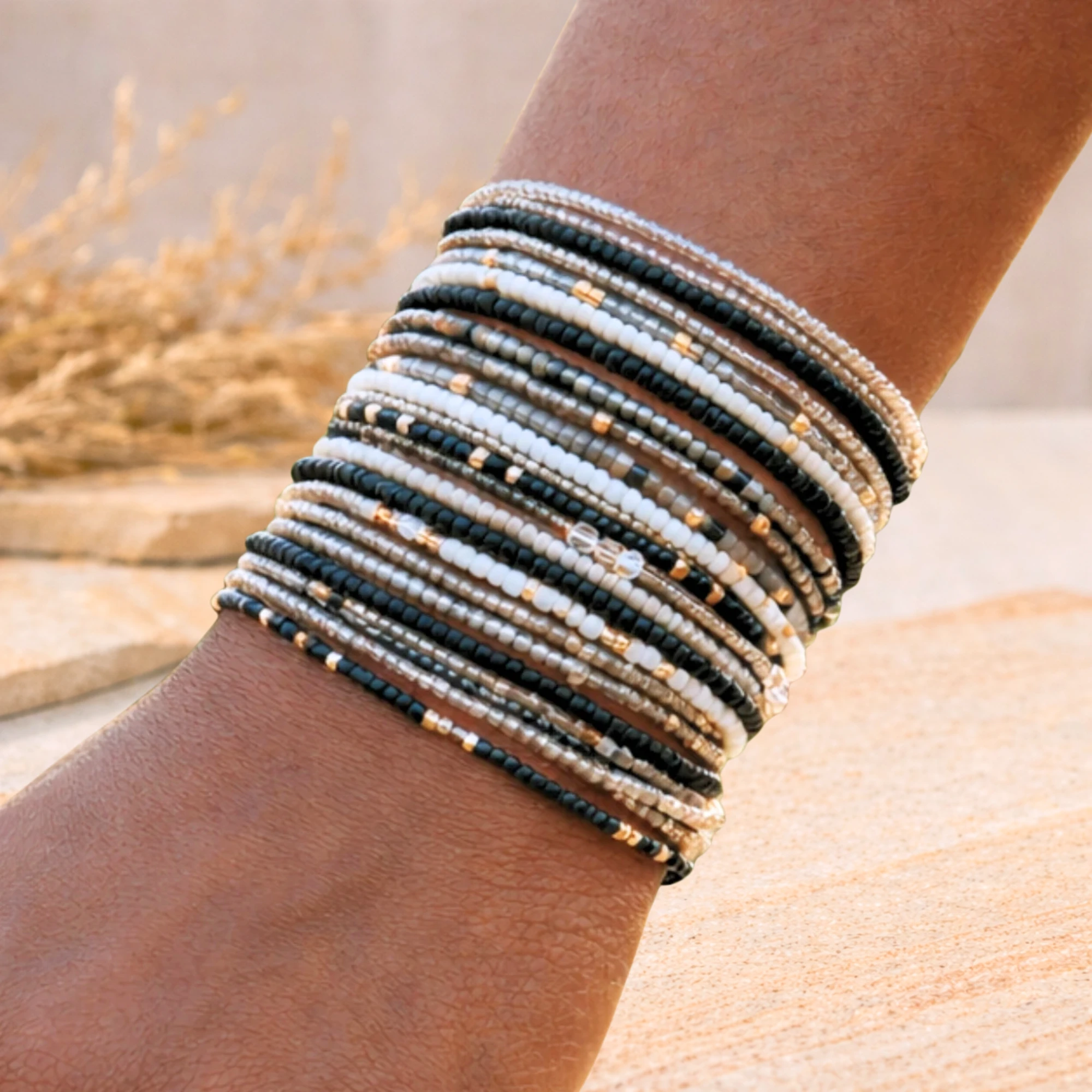This set features 10 stretchy seed bead bracelets in a moody mix of black, grey, silver, and white tones. Handmade and easy to wear, these versatile pieces bring edge, elegance, and effortless layering to your look.