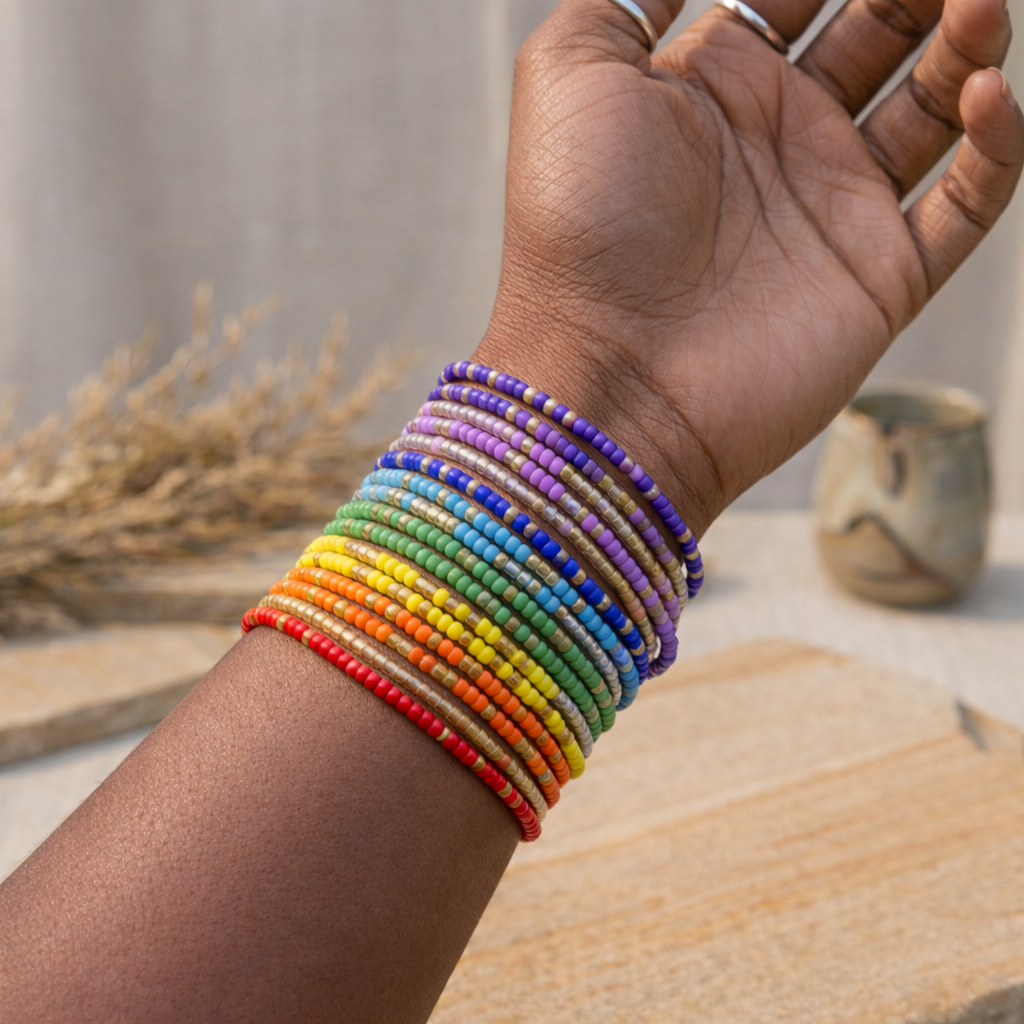 A vibrant stack of 10 seed bead bracelets featuring a mix of rich colors paired with subtle gold accents for a balanced, eye-catching look. Each strand is made with small 11/0 seed beads, creating a smooth, flexible fit that wraps comfortably around the wrist.
