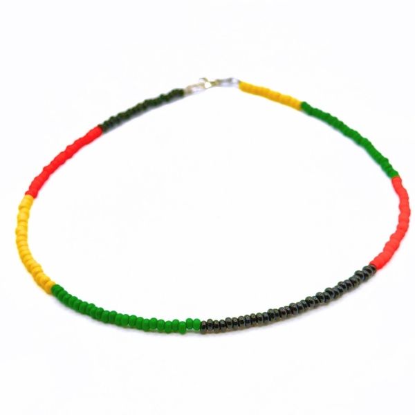 Beaded Rasta Block Necklace. Featuring vibrant red, yellow, green, and black seed beads.