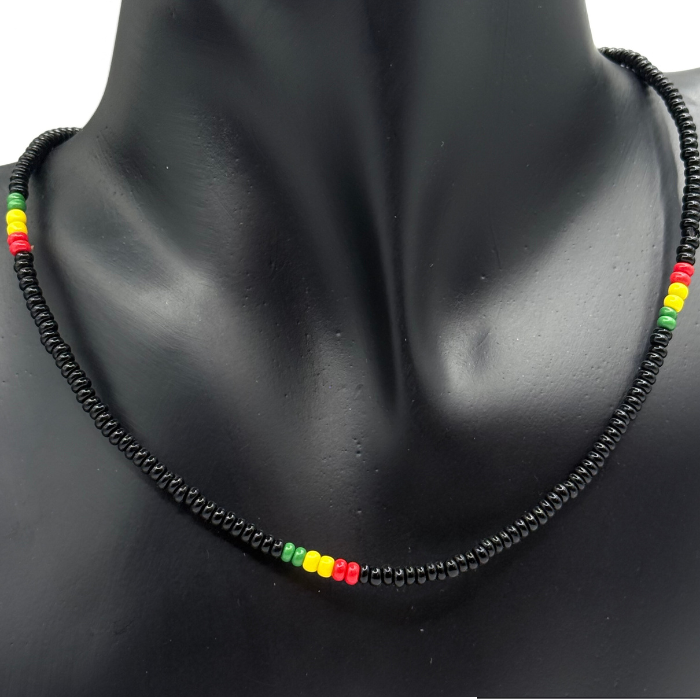 Celebrate culture and color with this Rasta Necklace. Featuring vibrant red, yellow, green, and black seed beads, this handmade piece honors Rasta heritage and Afro-Caribbean pride. Perfect for layering or wearing as a bold statement, it’s lightweight and easy to style for festivals, beach days, or everyday expression.